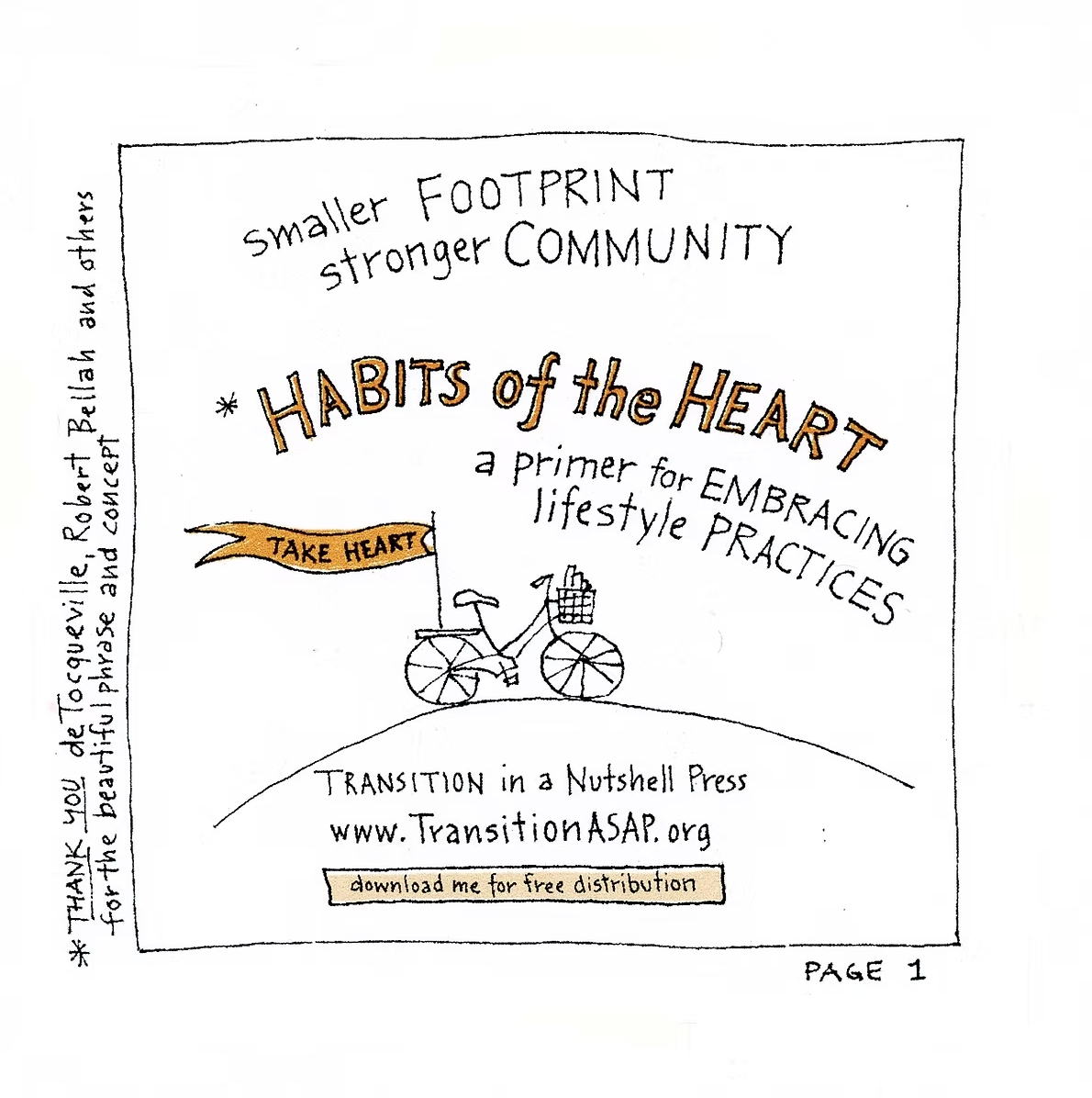 Thanks to Transition in a Nutshell Press, aka Regula and Michael Russelle, for "Habits of the Heart" and "Transition Towns." Regula, a book artist, and Michael, a soil scientist, wrote and designed them together during a long-distance trip on an Amtrak train.